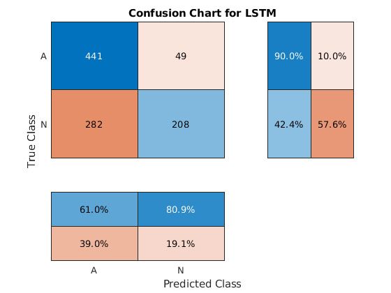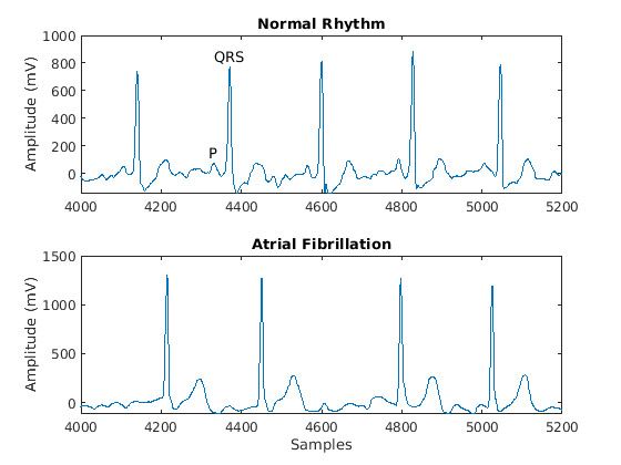 本例使用来自Physionet 2017挑战赛的心电图数据,可在获取数据。数据由一组300Hz的心电信号组成,由一组专家分成四个不同的类别:正常(N)、AFib(a)、其他节律(O)和噪声记录(~)。这个例子展示了如何使用深度学习自动化分类过程,实现区分正常心电图信号和房颤信号。