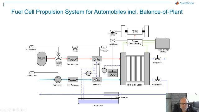 Powertrain Blockset™에 나와 있는 것처럼 전기화학 반응, 수소 및 공기 처리 및 열 관리 시스템이 포함된 PEM 연료 전지 모델은 배터리 시스템 및 전기 모터와 결합하여 연료 전지 가상 차량의 파워트레인을 모델링할 수 있습니다.
