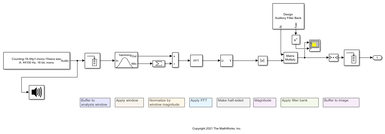 Create an auditory filter bank and apply it to a signal in the frequency domain using the Design Auditory Filter Bank block in Simulink®.