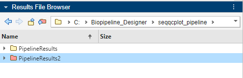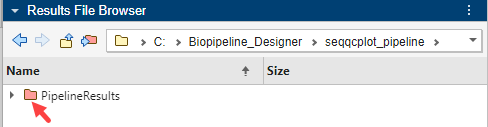 By default, the app saves the pipeline results in the PipelineResults folder in the MATLAB current folder. In this example, the current folder is C:\Biopipeline_Designer\seqqcplot_pipeline\ and the pipeline results folder is C:\Biopipeline_Designer\seqqcplot_pipeline\PipelineResults\ as shown in the Results File Browser pane.