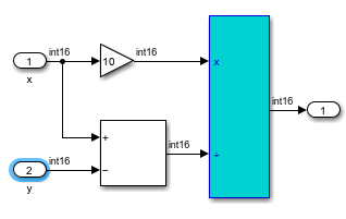 • Division by zero — This orange check is reported twice. One of these checks is reported in the statement rtb_y1 = (int16_T)((int16_T)(10 * 10) / (int16_T)(10 - rtb_x)). To trace the cause of this possible error, click the comment <S6>/Divide. The Simulink Editor highlights the Divide block. In the execution paths where the ÷ input equals zero, the division operation results in a Division by zero error.