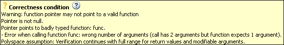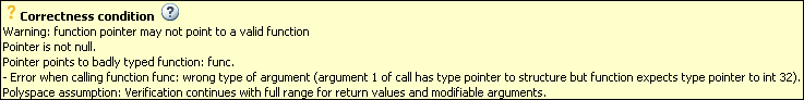 In the following example, an orange check occurs because Polyspace cannot determine if a function pointer points to a function when dereferenced. This situation can occur if, for instance, you assign an absolute address to the function pointer.