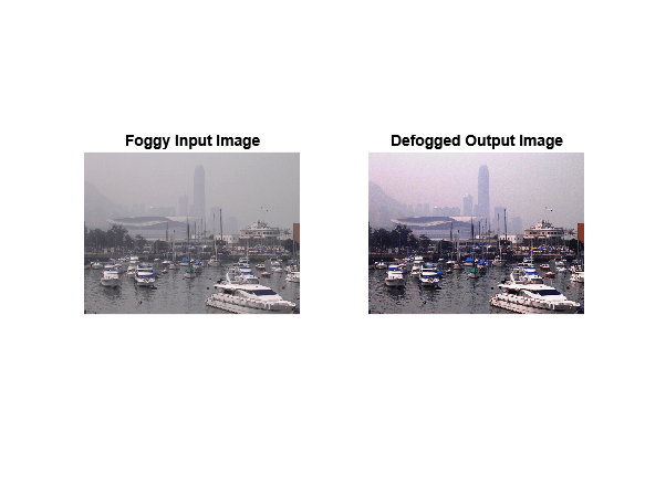 The fog_rectification_MLC entry-point function accepts an input image, performs fog removal by using dark channel estimation, and refines the image by using filters. It then enhances the contrast and returns the defogged image.