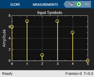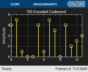 Running the model opens a scopes. The first scope plots the 6-symbol input frame, consisting of two 3-symbol messages of random integers in the range [0,8] to be encoded. The second scope plots the 14 symbol output frame, consisting of the two codewords output by the RS encoder.