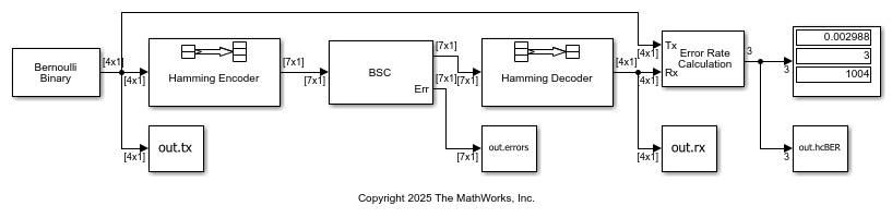 • A Hamming Encoder block encodes the data before sending it through the channel. The default code is the [7,4] Hamming code, which encodes message words of length 4 into codewords of length 7. As a result, the block converts frames of size 4 into frames of size 7. The code can correct one error in each transmitted codeword. The model sends the error rate results (out.hcBER), binary symmetric channel errors (out.errors), transmit data (out.tx), and decoded receive data (out.rx) to the workspace by using separate instances of the To Workspace block from the DSP System Toolbox™/Sinks library. This version of the To Workspace block preconfigures the block to output a 2-D array with each time step concatenated along the first dimension. For more information, see To Workspace Block Configuration for Communications System Simulations.