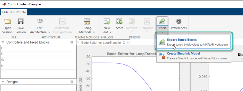 controlSystemDesigner를 입력합니다.Simulink 툴스트립: Apps 탭의 Control Systems 아래에서 앱 아이콘을 클릭합니다.