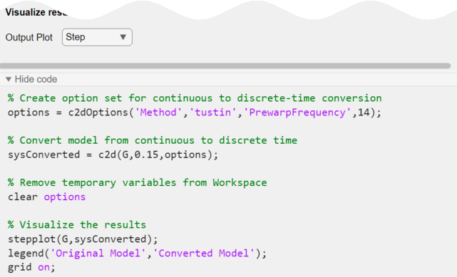 라이브 편집기에서 모델 레이트 변환 작업을 사용하여, 대화형 방식으로 연속시간 모델에서 이산시간 모델로 변환합니다. 다른 방법, 옵션, 응답 플롯을 사용해 보십시오. 작업은 선택 내용을 반영하여 코드를 자동으로 생성해 줍니다. 모델 레이트 변환 작업이 포함된 사전 구성된 스크립트를 보려면 이 예제를 여십시오.