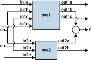 는 다음 그림에 보이는 것처럼 보다 일반적인 병렬 상호 연결을 형성합니다.sys = parallel(sys1,sys2,in1,in2,out1,out2)
