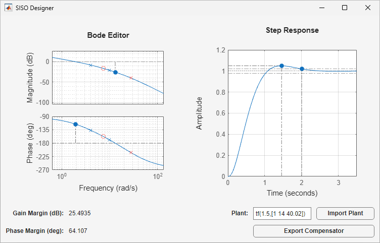 • View the closed-loop step response and stability margins as they update the compensator.