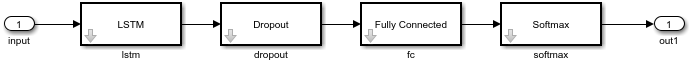 이 예에서는 LSTM 위에 커서를 올리고 열기를 클릭합니다. 신경망을 Simulink로 내보내려면 내보내기 > Simulink로 내보내기를 선택하십시오. Simulink로 내보내기 대화 상자에서 내보낼 형식을 다중 계층 블록으로 선택합니다. 신경망 파라미터가 포함된 Simulink 파일을 저장할 위치를 선택한 다음 내보내기를 클릭합니다. 내보내는 동안 신경망이 초기화되지 않은 경우 앱이 신경망의 초기화를 시도합니다.