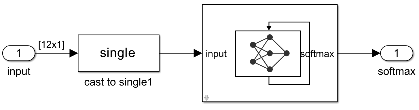 모델을 단일 신경망 블록으로 내보낼 수도 있습니다. 심층 신경망 디자이너에서 내보낼 형식을 단일 신경망 블록으로 선택합니다. 이 예제에서는 앱이 신경망을 Stateful Predict 블록으로 내보냅니다.
