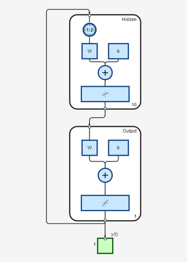 폐루프 신경망을 표시합니다. 이 신경망에는 입력값이 하나만 있습니다. 폐루프 모드에서는 이 입력값이 출력값에 연결됩니다. 지연된 목표 입력값은 지연된 직접 출력 연결로 대체됩니다.