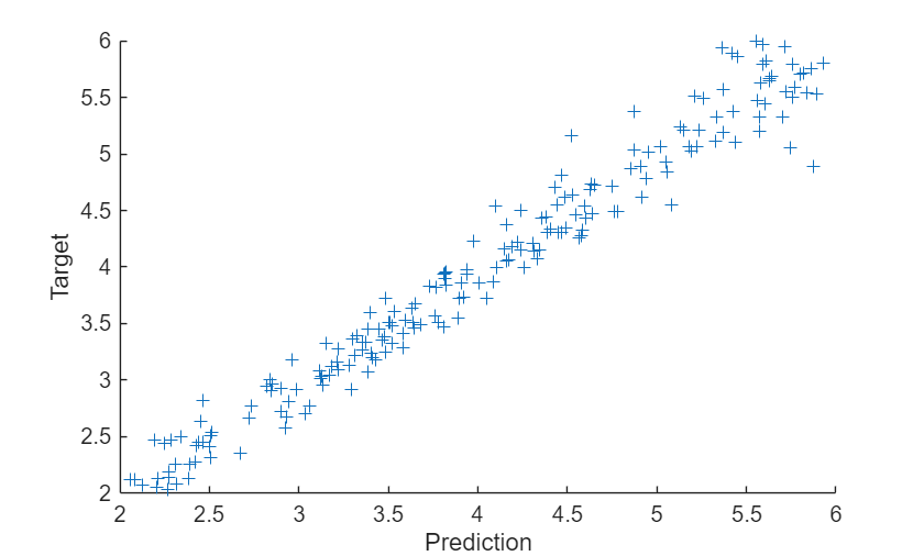 figure scatter(YTest,TTest,"+") xlabel("Prediction") ylabel("Target")