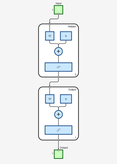 [x,t] = simplefit_dataset; net = feedforwardnet(3); net = configure(net,x,t); view(net)