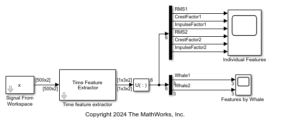 Display the extracted features using Scope blocks. The Features by Whale scope shows the features for each whale in a separate display. The Individual Features scope shows each feature for each whale in a separate display. Use Demux blocks to separate the extracted features and connect the outputs to the Scope blocks.