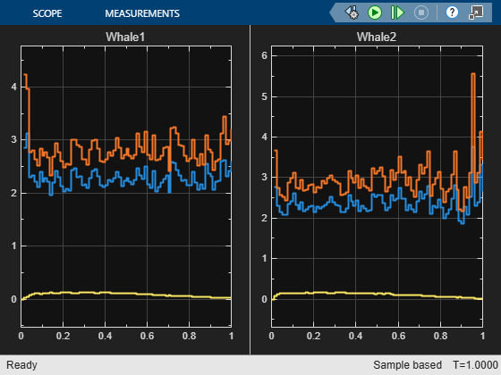 Open the TimeFeaturesTwoWhales.slx model. The two-channel input signal x comes from a preloaded dataset labelwhalesignals that includes two recordings of blue whale songs that contain trills and moans. For more information about the whale songs dataset, see Label Signal Attributes, Regions of Interest, and Points.