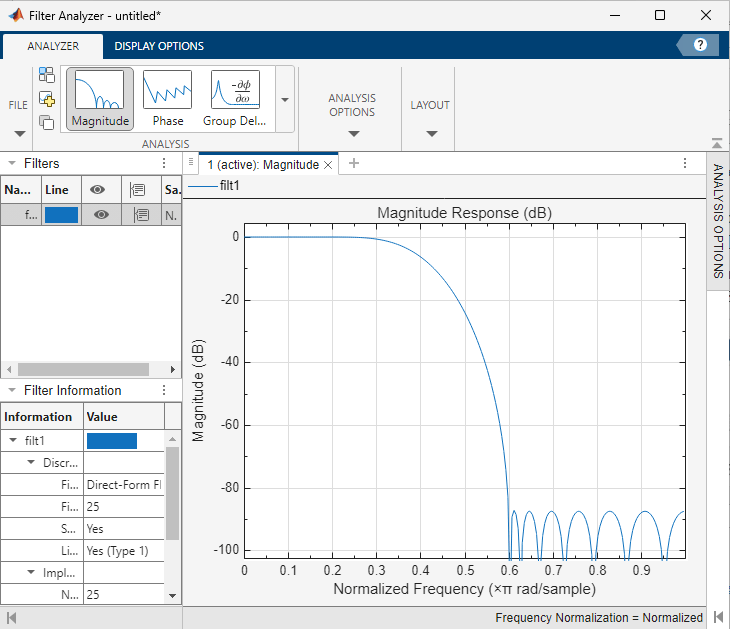 To open the Filter Analyzer tool and see the magnitude response of the filter, click the Analyze button.