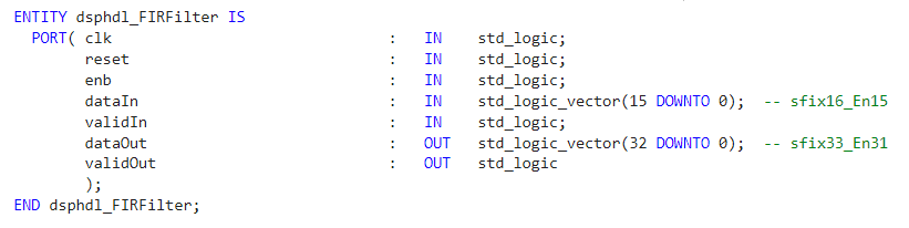 The generated VHDL® entity shows the IP block interface, including control signals and the data types that you specified.