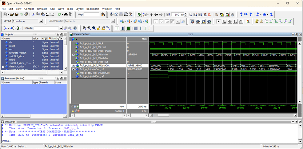 Open the ModelSim simulator and navigate to the codegen\hdlsrc folder. To compile and simulate the generated HDL testbench, at the command prompt in ModelSim, run the generated hdl_IP_tb_compile.do and hdl_IP_tb_sim.do scripts. The output data matches the expected reference data and the testbench passes with no errors.
