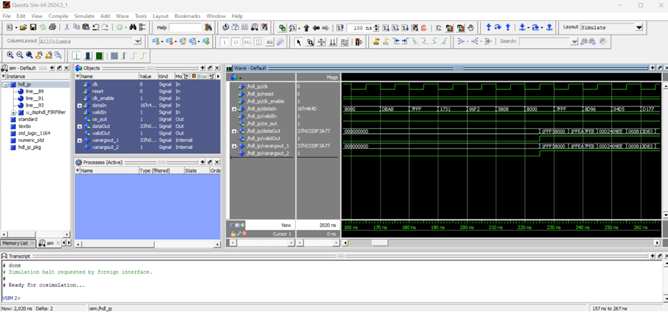 To simulate the cosimulation testbench, in the MATLAB command window, call the generated run_hdl_IP_cosim script. In the simulation output, look for these messages: