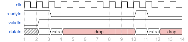 If the upstream part of your design has multiple data samples available and synchronously reacts to the block setting ready low, then one extra cycle of input data can arrive at the port. To support synchronous control logic, such as the HDL FIFO (HDL Coder) block in Classic mode, the block reserves room to store this extra data while processing the current data and does not set ready high until it processes the additional input data. This waveform shows a system that synchronously releases data in response to ready. The block accepts one extra cycle of data even though ready is low, and does not set ready high again until it has processed both inputs. The block returns the output data in its usual pattern. The throughput is two samples every eight cycles, the same overall rate as above.