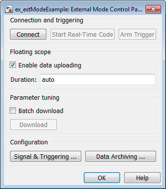 ExtModeEnableFloatingoff, on | External Mode Control Panel: Enable data uploading check box | Enable or disable the arming and canceling of triggers when a connection is established with floating scopes. |