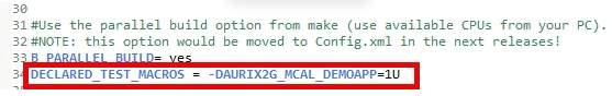 • Default settings related to the MCAL demo application in the Config.mk file (located at <Project_Path>/1_ToolEnv/0_Build/1_Config/Config.mk) have been updated for a motor control application in this example.