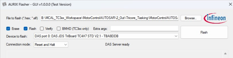 2. To deploy on the hardware board, open AURIX Flasher and check connectivity. Then, select the generated ELF or HEX file to flash, and click Flash.