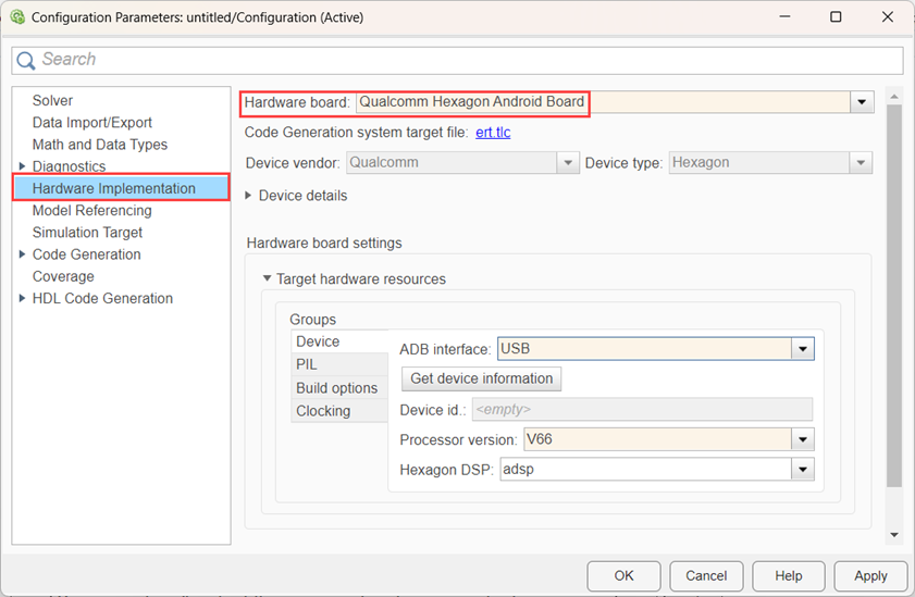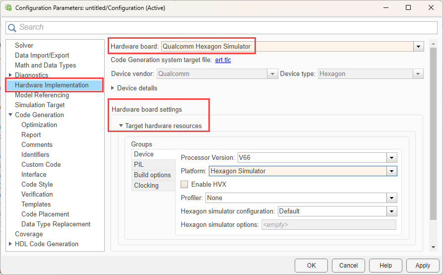 | Platform | Select the device platform for the selected hardware board. | Hexagon Simulator |
