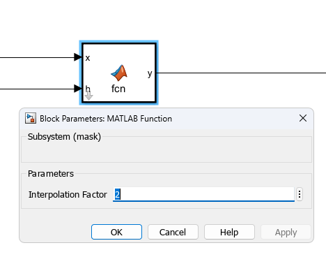 The function block creates states using persistent variables and processes input data and coefficients through ports to compute the output. You can refer to the model implementation by opening the model using this command: