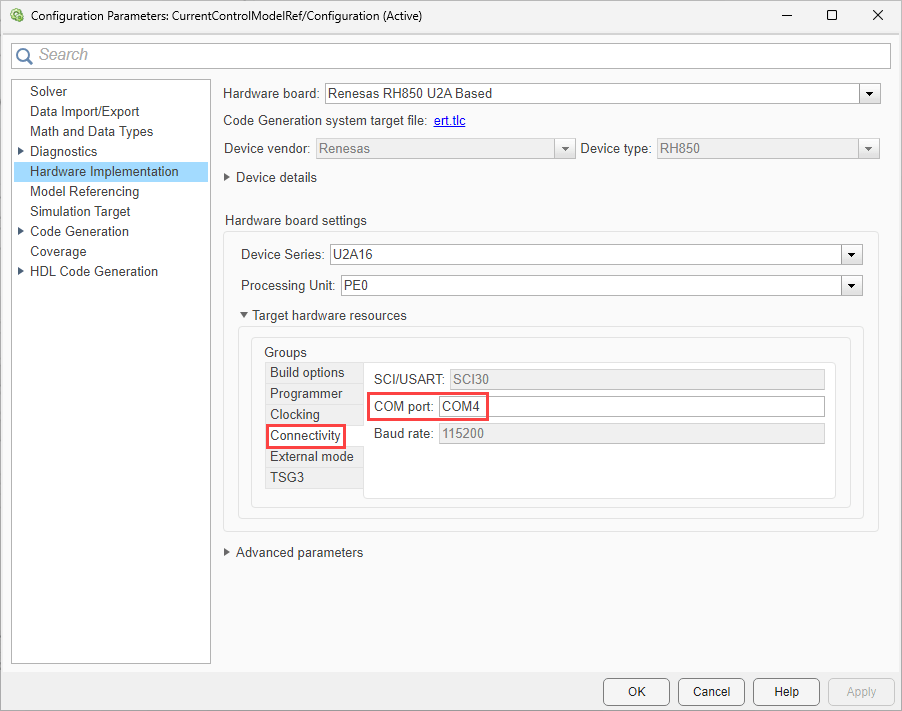 2. In the Configuration Parameters dialog box, navigate to Hardware Implementation > Hardware board and select Renesas RH850 U2A Based board.