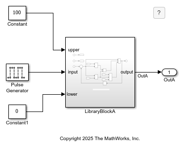 Open the libraryRef2 model. libraryRef2 contains two instances, LibraryBlockA and LibraryBlockB, of the same linked library block from the faultedCounterLibrary library. However, libraryRef2 is not synchronized, and the block in faultedCounterLibrary contains a fault. This fault in does not appear in the parent model in either the LibraryBlockA and LibraryBlockB instances.