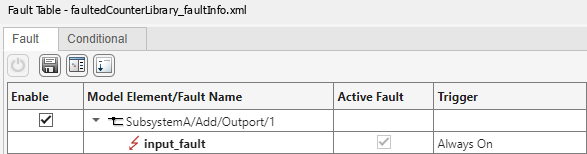 The model contains a subsystem named LibraryBlockA, which is an instance of the linked library block from the faultedCounterLibrary library. However the Fault Table pane indicates that the model does not have faults. To get the fault, synchronize the fault information. In the Fault Analyzer tab, in the in the Prepare Faults section, click Resync Faults. The model now includes a copy of the fault in the linked library.