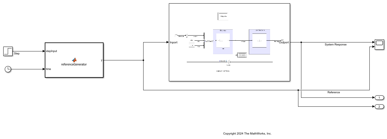 The massSpringDamperPID_modelFMU Simulink model imports the generated FMU into Simulink. The referenceGenerator function creates a reference signal for the controller to follow. The reference signal is initially a step input that sets the position of the mass to a non-zero steady state. After a specified time, the reference signal is an oscillating sine wave about this point.