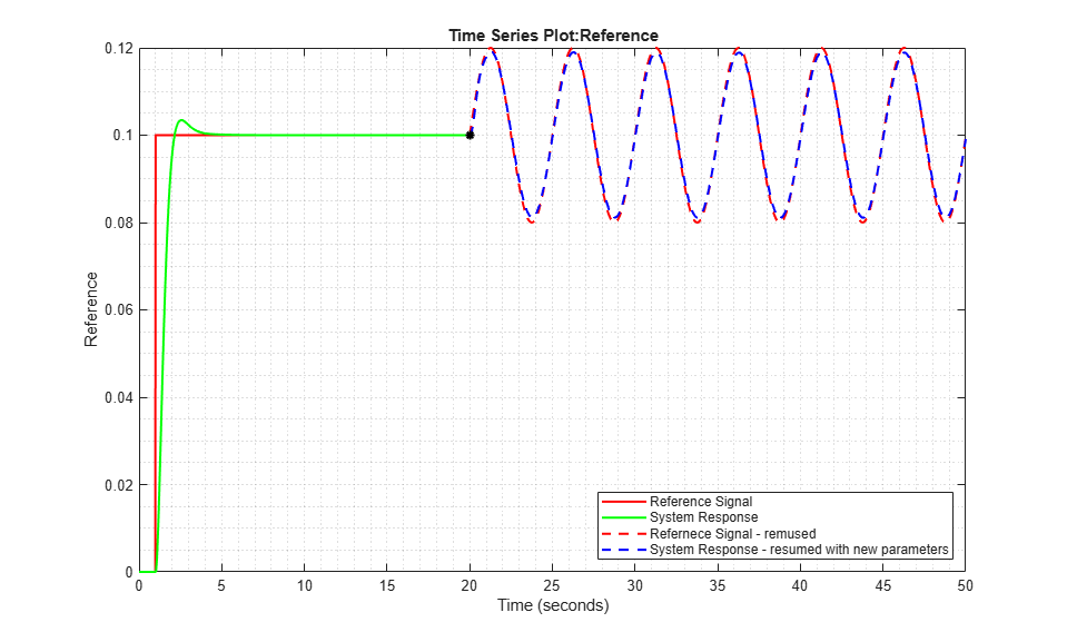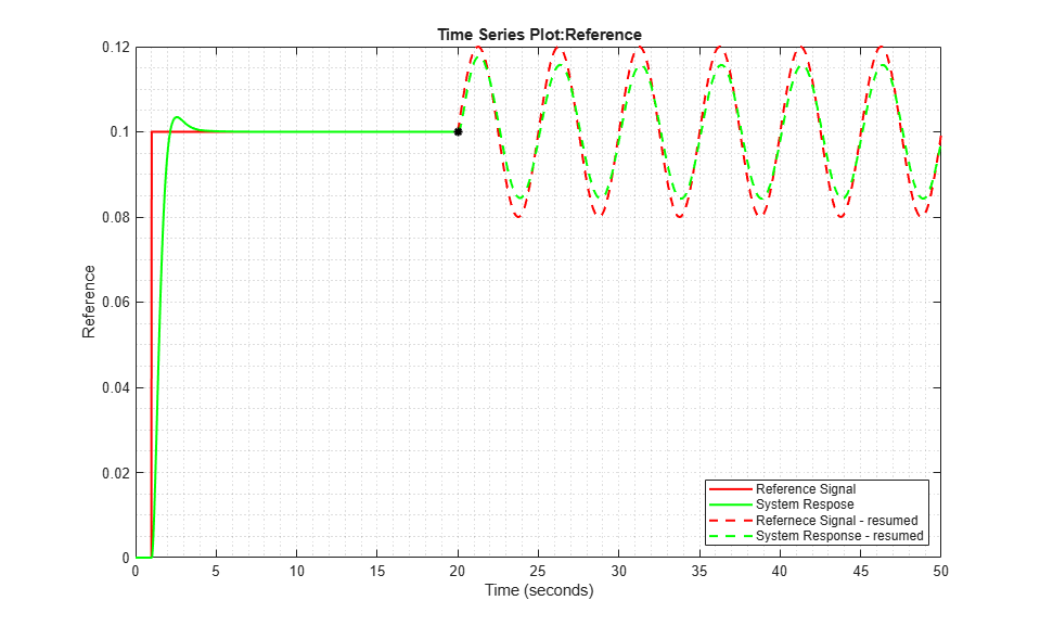 simOPResume = Simulink.SimulationInput(model_for_sim); simOPResume = setModelParameter(simOPResume, 'StopTime', '50'); simOPResume = setInitialState(simOPResume, initialSim.xFinal); resumeSim = sim(simOPResume); plot(resumeSim.yout{2}.Values, '--r', 'LineWidth', 1.5); hold on; plot(resumeSim.yout{1}.Values, '--g', 'LineWidth', 1.5); hold on; plot(initialSim.yout{1}.Values.Time(end), initialSim.yout{1}.Values.Data(end), '*k', 'LineWidth', 1.5); hold on; plot(initialSim.yout{2}.Values.Time(end), initialSim.yout{2}.Values.Data(end), '*k', 'LineWidth', 1.5); legend('Reference Signal', 'System Respose', 'Refernece Signal - resumed', 'System Response - resumed', 'Location','southeast');