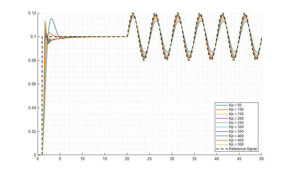 set_param('massSpringDamperPID_modelFMU/FMU','Kp','1'); set_param('massSpringDamperPID_modelFMU/FMU','Kd','50'); set_param('massSpringDamperPID_modelFMU/FMU','Ki','100'); set_param(model_for_sim, 'StartTime', '0', 'StopTime', '50'); plot_fastRestart = figure(3); grid minor; hold on; kp_array = 50:50:500; num_kp_array = length(kp_array); legendEntries = cell(num_kp_array+1,1); for i = 1:num_kp_array set_param('massSpringDamperPID_modelFMU/FMU', 'Kp', num2str(kp_array(i))); outFastRestart = sim(model_for_sim); plot(outFastRestart.yout{1}.Values, 'LineWidth', 1.2); legendEntries{i} = ['Kp = ', num2str(kp_array(i))]; hold on; end plot(outFastRestart.yout{2}.Values, '--k', 'LineWidth', 1.5); legendEntries{end} = 'Reference Signal'; legend(legendEntries, 'Location','southeast');