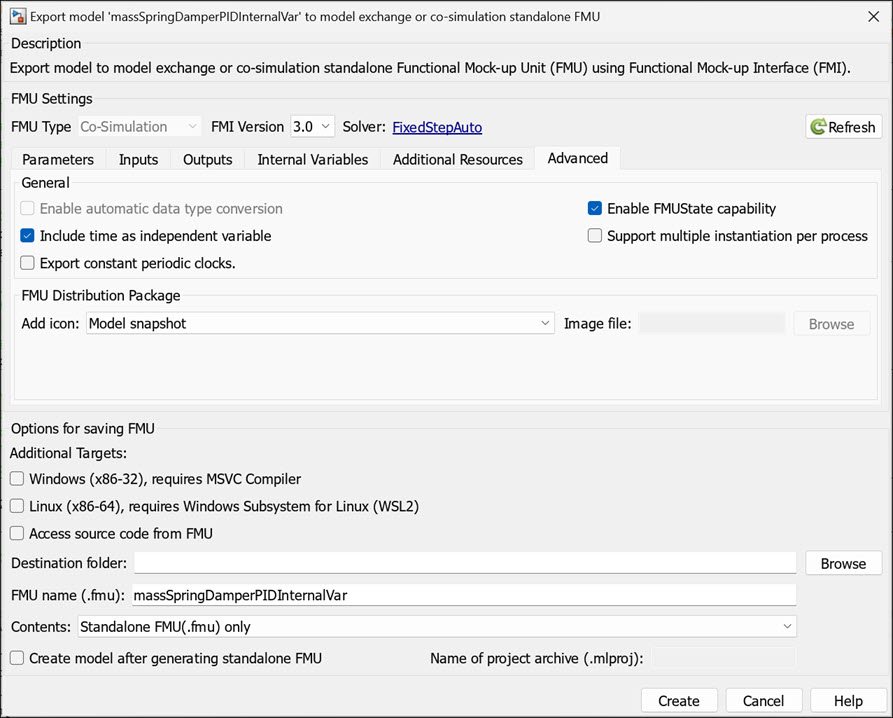 You can also use the FMU Export dialog box to generate the FMU. In the Simulation tab on the Simulink toolstrip, click drop-down button for Save. Select Standalone FMU..... This opens the FMU Export dialog box. Open the Advanced tab within the dialog box and select the Enable FMUState capability check box. Click Create to generate the FMU.