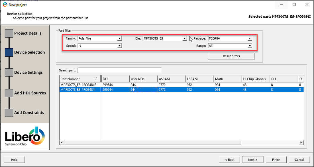 1. Create an empty Microchip Libero project by using below settings for PolarFire family and Click Next. Click Finish to create a new Libero project.
