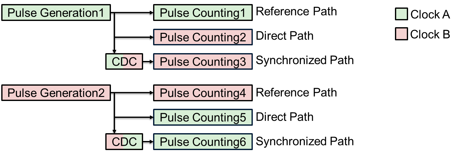 • Synchronized path, which generates pulses and counts them in the clock B domain by using a CDC-based pulse synchronizer.