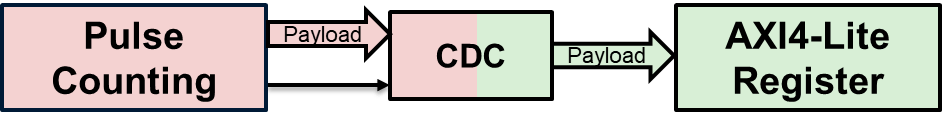 To store the counts in AXI4-Lite registers, which reside in clock domain A, the design synchronizes the output of the pulse counters from clock domain B with clock domain A. This image shows how the design uses a CDC pulse synchronizer to synchronize the multi-bit count data to the clock A domain. The counter value is the data payload, and the pulse acts as a valid signal that indicates when to sample or transfer the data.