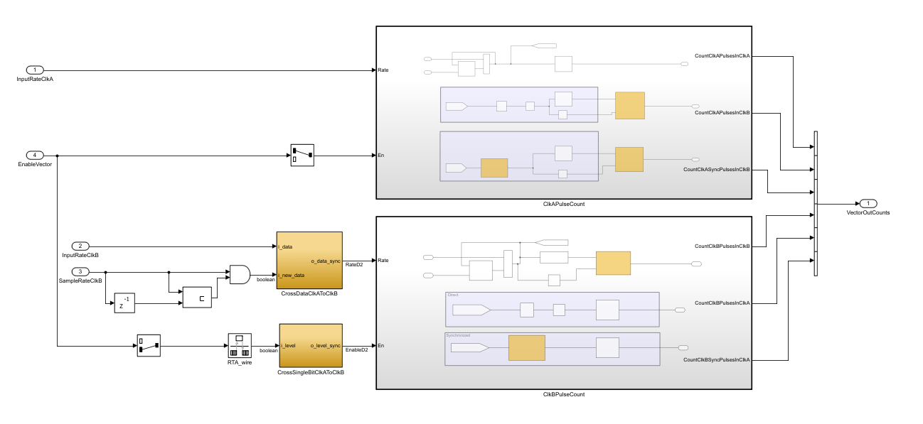 To view the implementation, open the CrossDataClkBToClkA1 block in the ClkAPulseCount subsystem.
