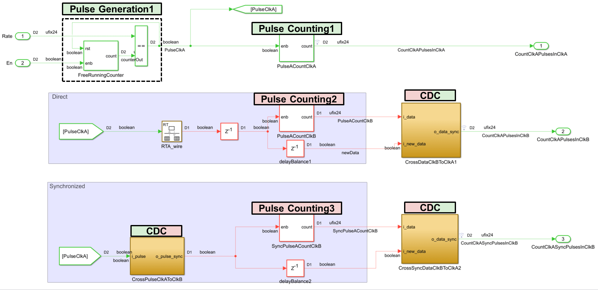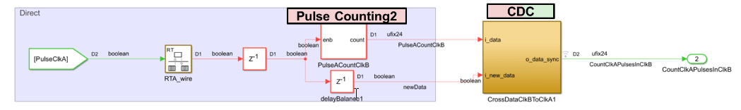 Open the ClkAPulseCount subsystem to see the three parallel data paths for the pulse generator in the clock A domain.