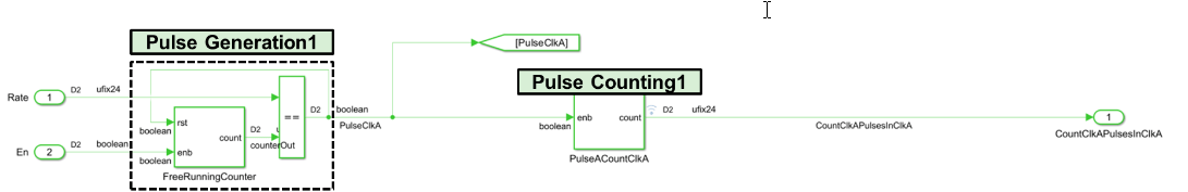 To generate the pulse, the model uses a free-running counter. When the counter reaches the value specified by the Rate Inport block, it generates a pulse signal, PulseClkA. The HDL Counter block PulseACountClkA uses these pulses as the enable signal to count the periodic pulses in the originating clock domain.
