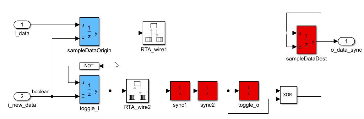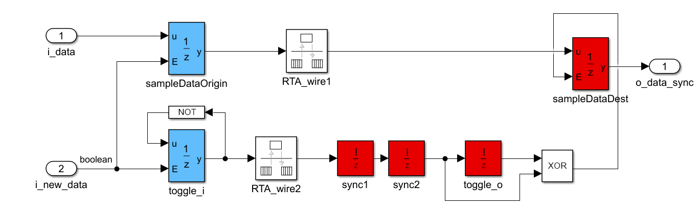 • The path from the originating clock domain to the first flip-flop of the synchronizer is a false path. To specify this path as a timing exception, the custom synthesis attribute cdc_falsepath is set to data on the same signal to later identify it in the timing constraint. In this synchronizer, ASYNC_REG preserves the signal at the output of the sync1 delay block. For more information on how to set synthesis attributes, see Configure Custom Synthesis Attributes for Simulink Blocks.