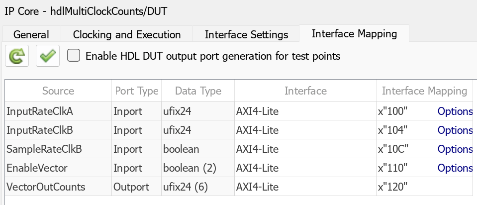 Next, configure the design to map to the target hardware by mapping the DUT ports to the IP core target hardware and setting the DUT-level IP core options. In this example, map all DUT ports to AXI4-Lite interfaces.