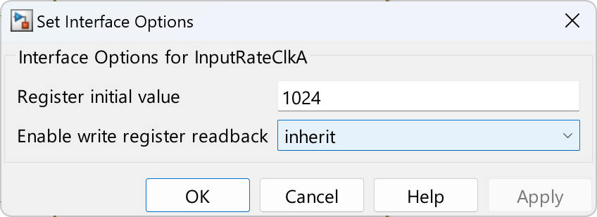 3. Click the Options link next to InputClkRateA and InputClkRateB and in the Set Interface Options dialog box, set Register initial value to a non-zero value. This setting ensures the pulse generators are idle at reset and only start when enabled.