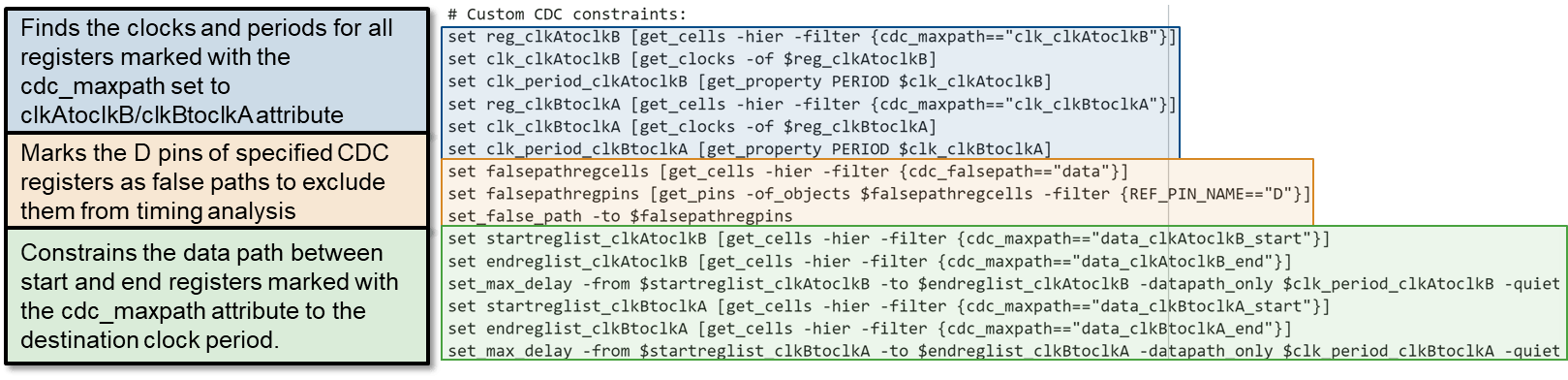 Based on the custom synthesis attributes, to constrain your design, the customDUTCDC XDC file includes a custom set of Tcl commands. This image shows the contents of the customDUTCDC.xdc file and a description of the actions performed by the commands.