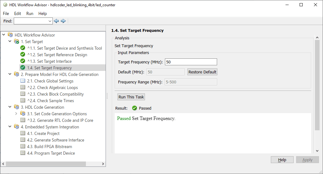 1.1. Open the HDL Workflow Advisor from the hdlcoder_led_blinking_4bit/led_counter subsystem by right-clicking the led_counter subsystem, and choosing HDL Code > HDL Workflow Advisor.