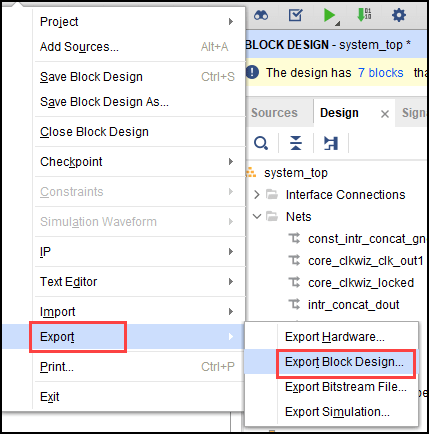 5. Export the complete block design as a Tcl script. In the Files tab, click Export and select Export Block Design. Name the Tcl script as system.tcl.