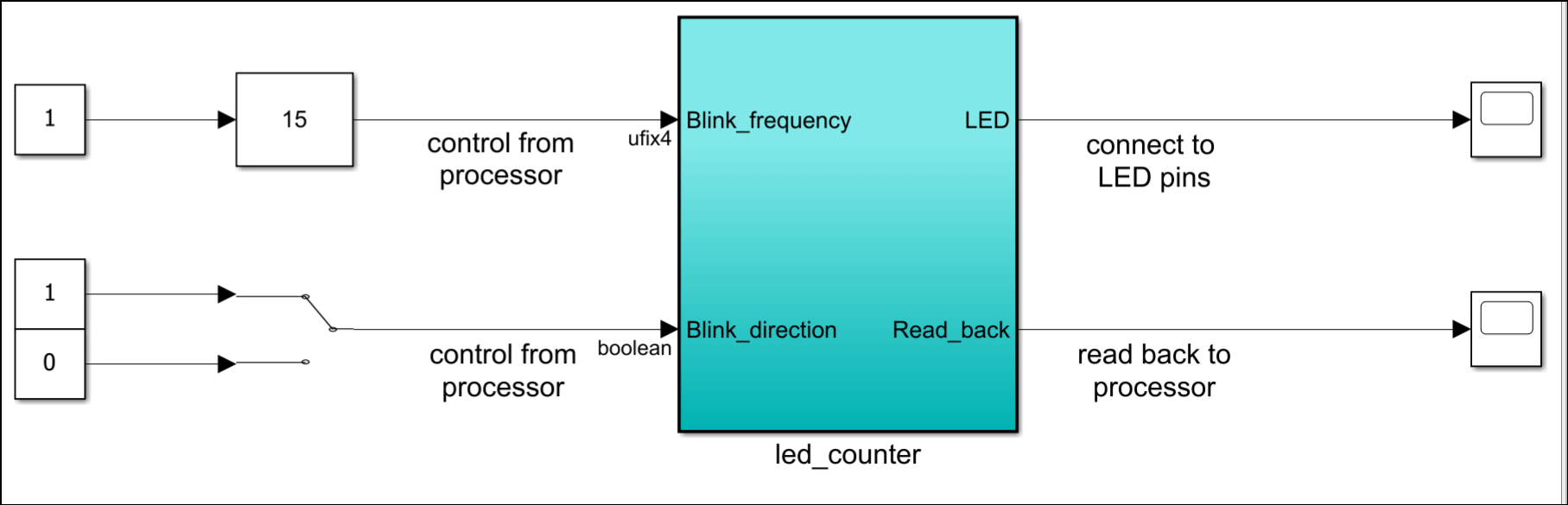 The design under test (DUT) subsystem, led_counter, models a counter that blinks the LEDs on an FPGA board. It has two input ports, Blink_frequency and Blink_direction, which determine the LED blink frequency and direction. The output ports, LED, connects to the user-defined LEDs on the board. The output port Read_back outputs the count value. The board processor sends this value to MATLAB.
